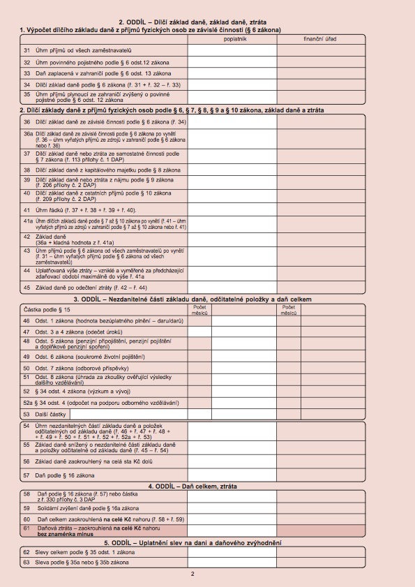 2. Dílčí základy daně z příjmů fyzických osob podle § 6, § 7, § 8, § 9 a § 10 zákona, základ daně a ztráta